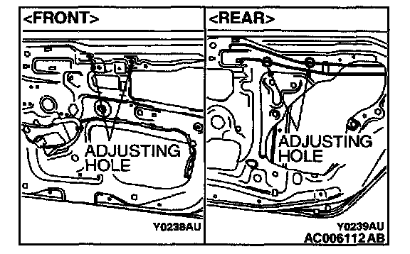 DOOR WINDOW GLASS ADJUSTMENTCheck that the door glass moves white contacting the door glass channel when it is raised and lowered fully. If not, adjust the door window according to the following procedures.