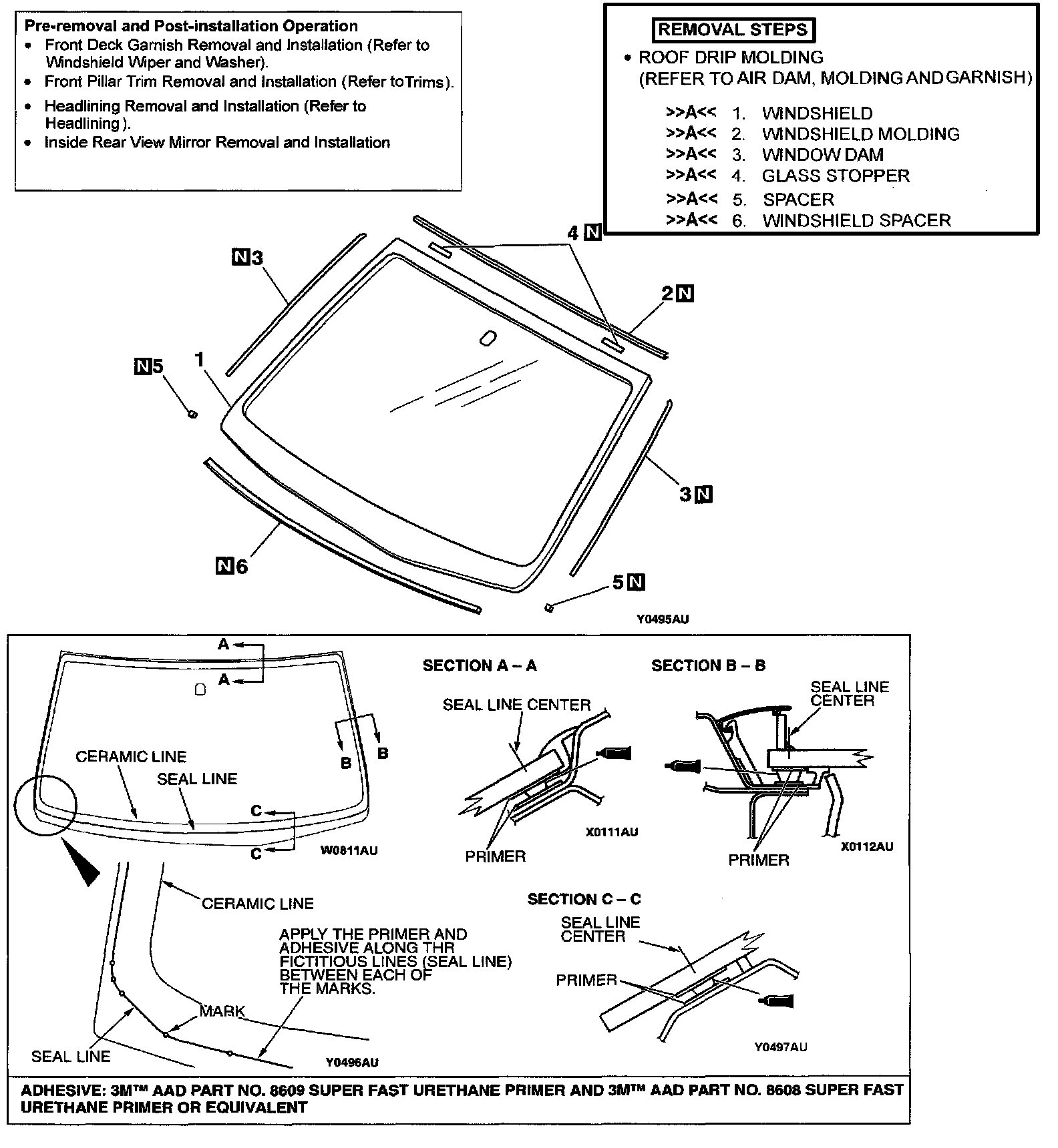 7. Bond the windshield to the body, and install the roof drip molding quickly before the adhesive cures (Refer to Air dam, molding and garnish).