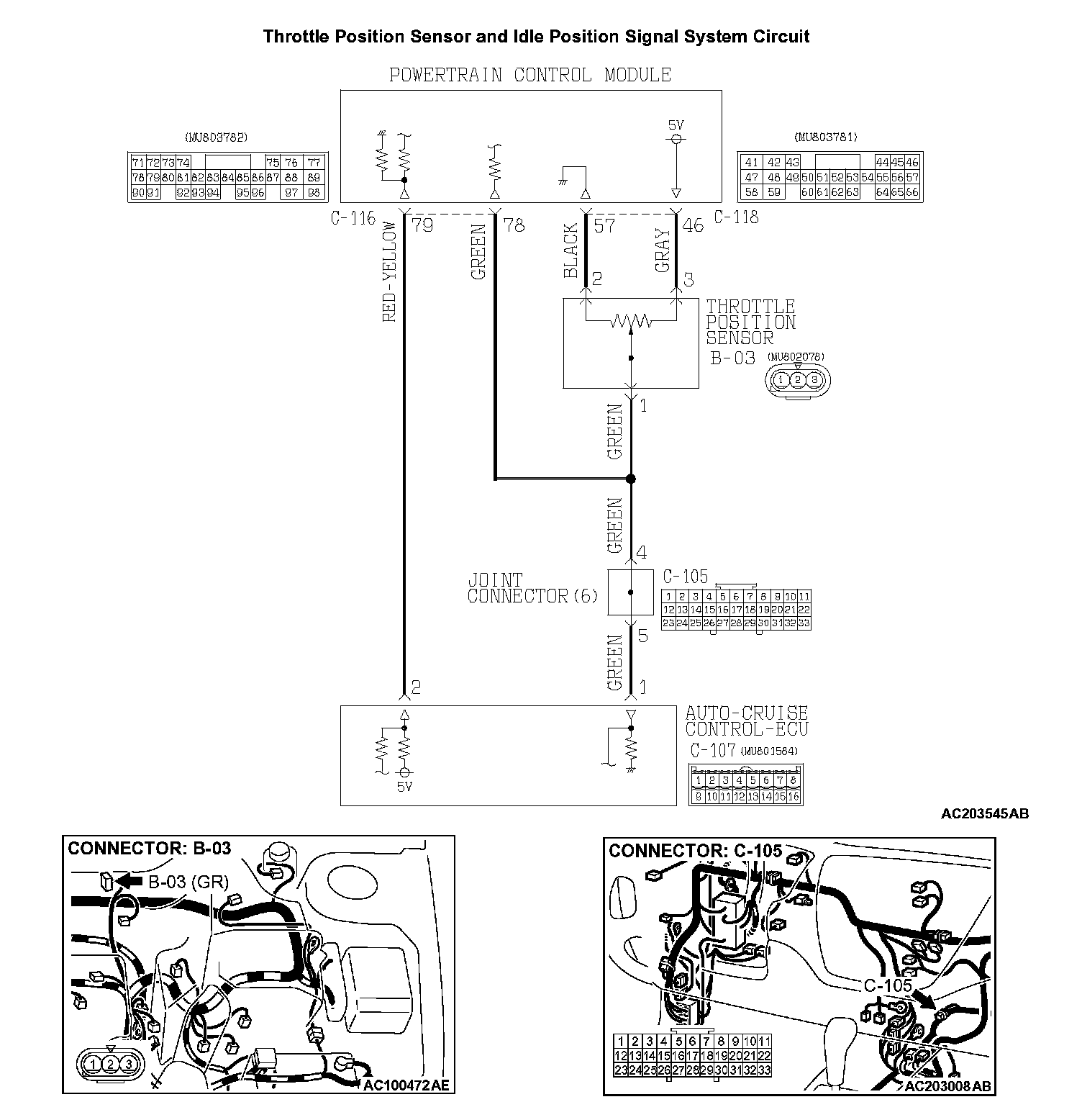 STEP 4. Check the harness wire between throttle position sensor connector B-03 terminal 1 and auto-cruise control-ECU connector C-107 terminal 1 for damage.