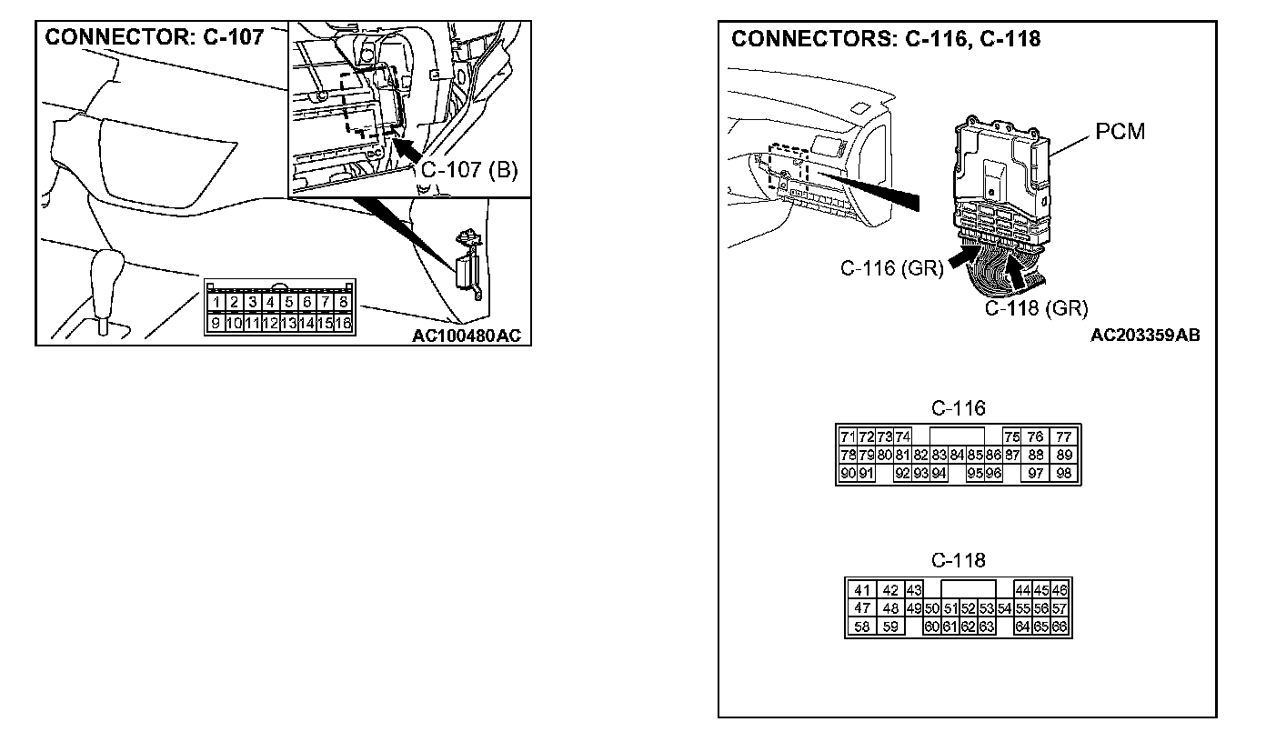 STEP 6. Check PCM connector C-116 and auto-cruise control-ECU connector C-107 for loose, corroded or damaged terminals, or terminals pushed back in the connector.