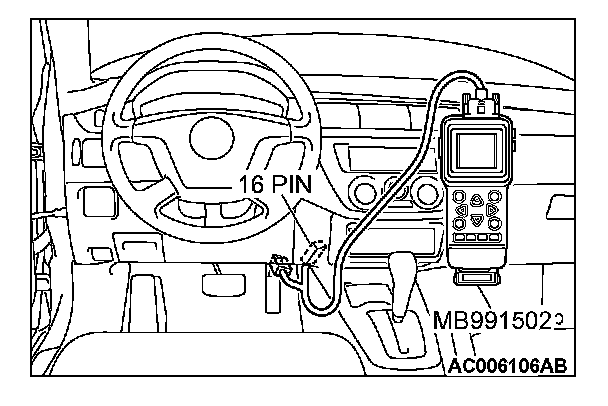 CAUTION: To prevent damage to scan tool MB991502, always turn the ignition switch to the "LOCK" (OFF) position before connecting or disconnecting scan tool MB991502.