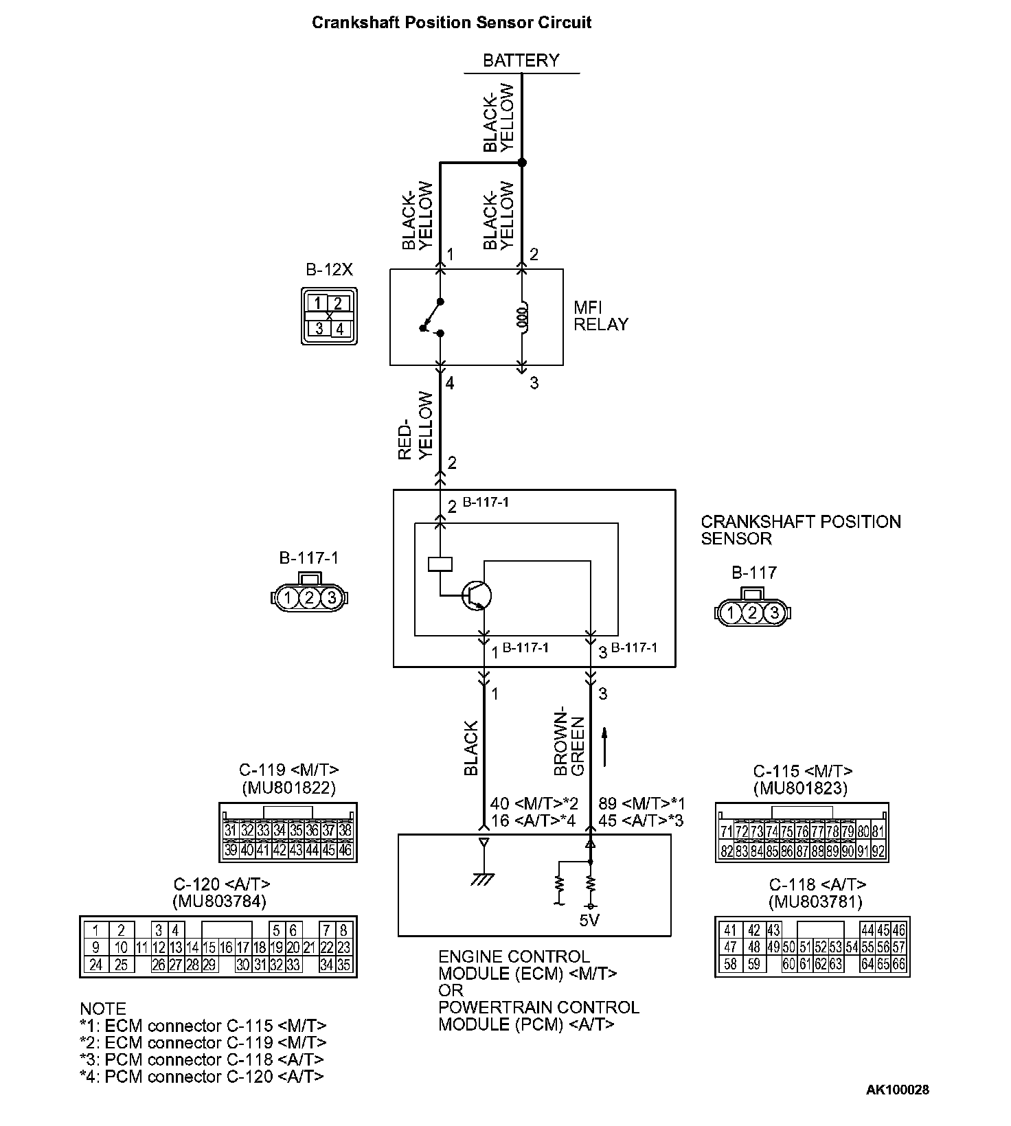 - The crankshaft position sensor power is supplied from the MFI relay (terminal No. 4).