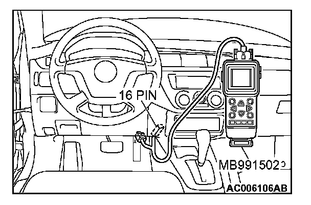 CAUTION: To prevent damage to scan tool MB991502, always turn the ignition switch to the "LOCK" (OFF) position before connecting or disconnecting scan tool MB991502.