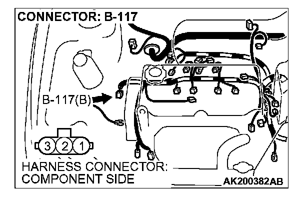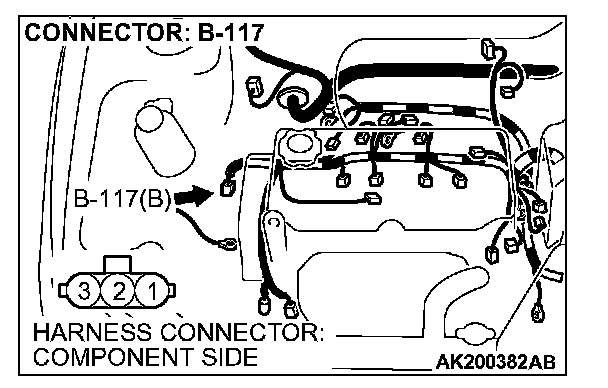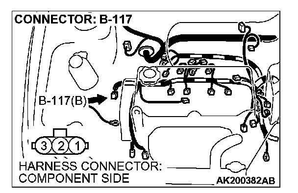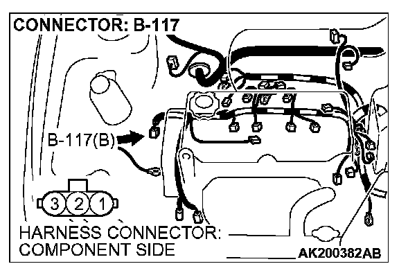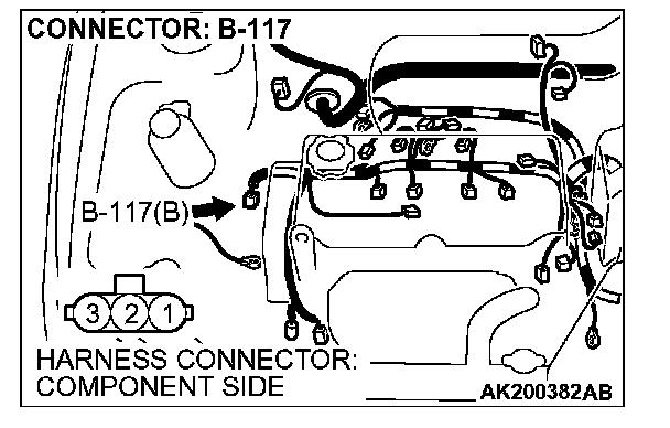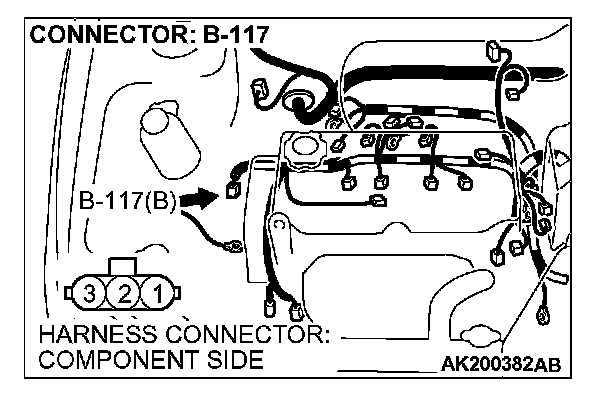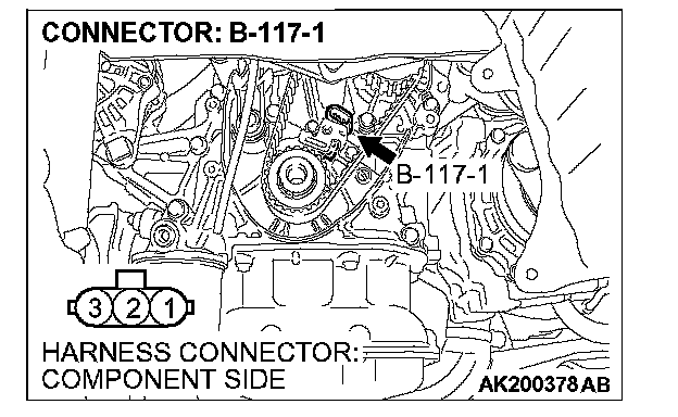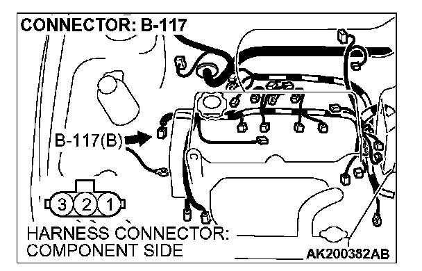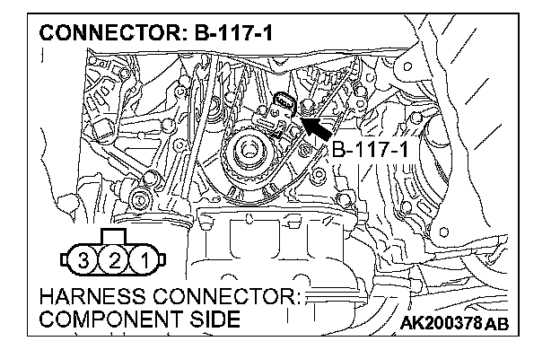 1. Disconnect the crankshaft position sensor intermediate connector B-117, and connect test harness special tool (MB991658) in between. (All terminals should be connected.)