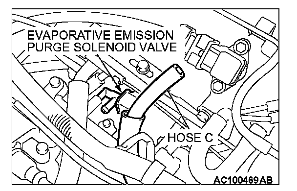1. Disconnect hose C from the evaporative emission purge solenoid and connect a hand vacuum pump to the nipple of the evaporative emission purge solenoid.