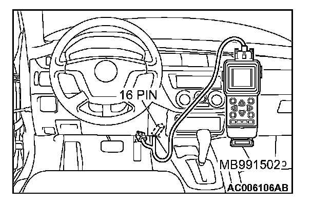 CAUTION: To prevent damage to scan tool MB991502, always turn the ignition switch to the "LOCK" (OFF) position before connecting or disconnecting scan tool MB991502.