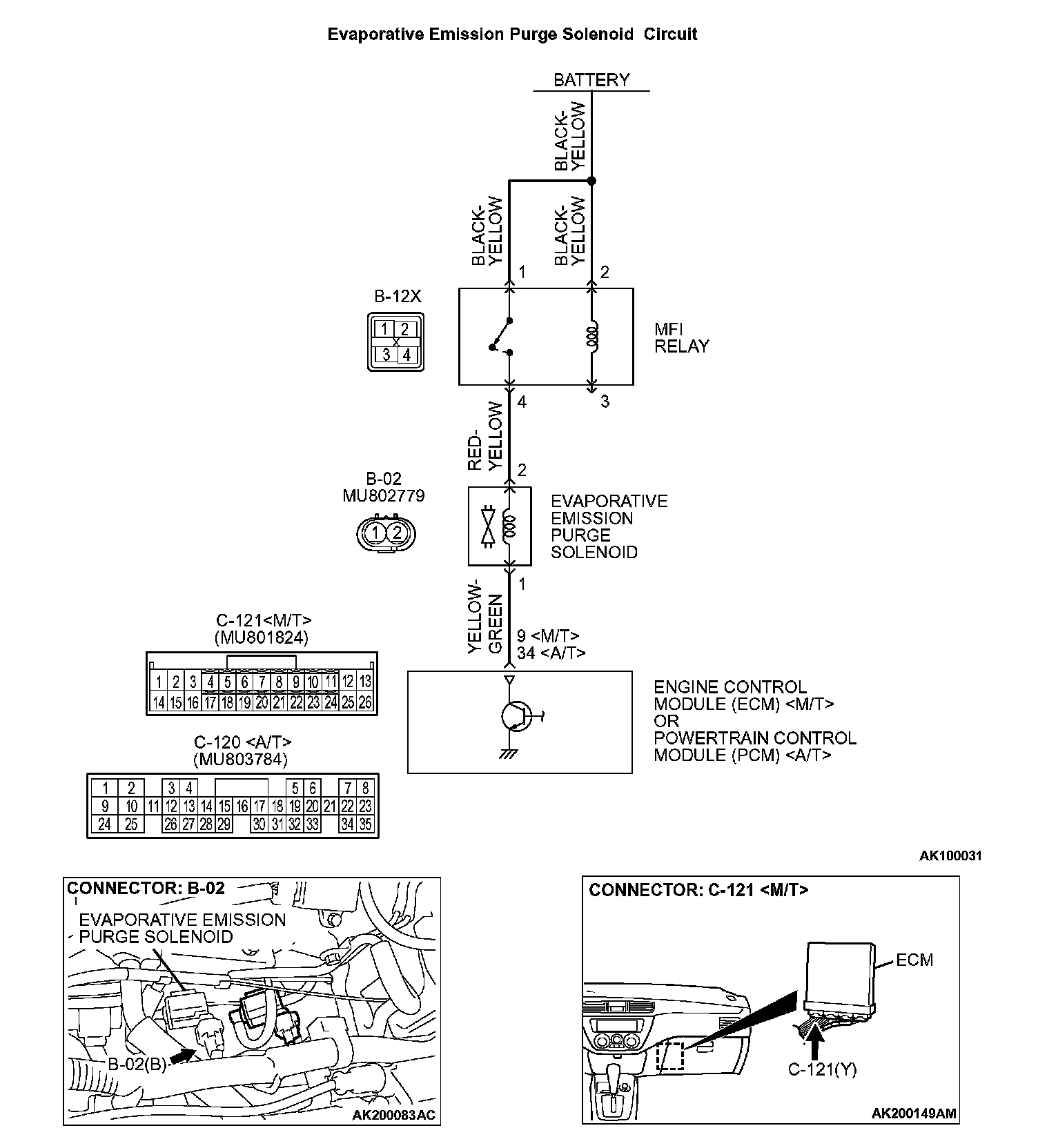 STEP 10. Check for harness damage between MFI relay connector B-12X (terminal No. 4) and evaporative emission purge solenoid connector B-02 (terminal No. 2).
