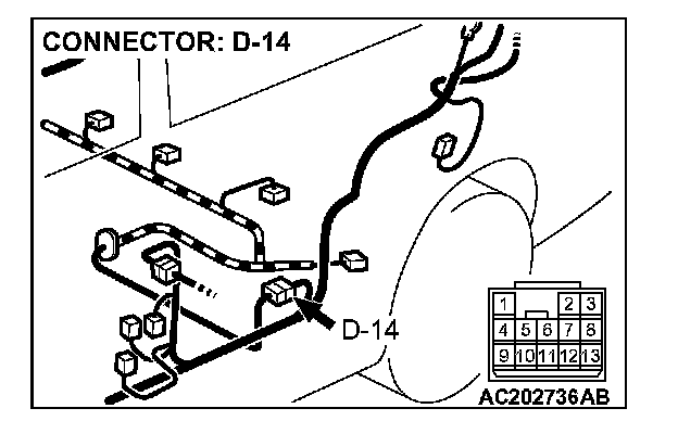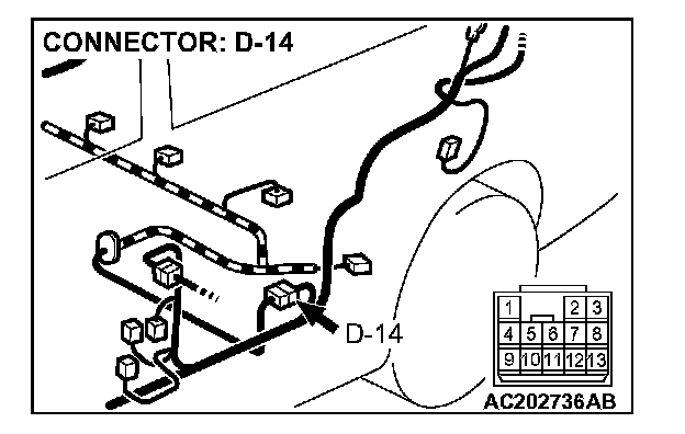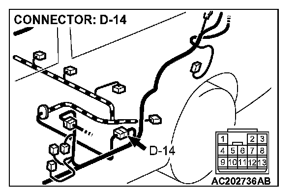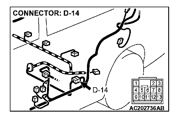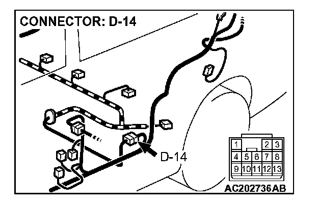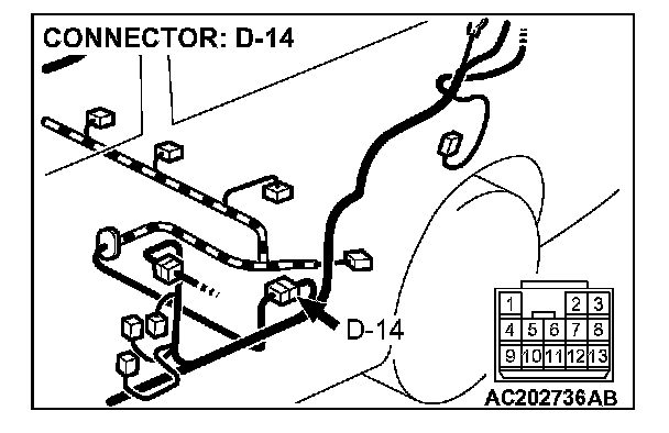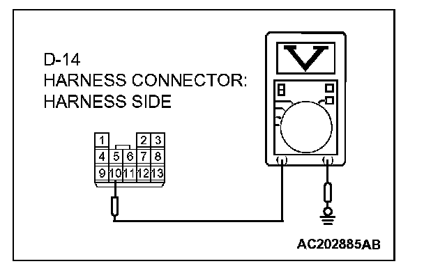 3. Measure the voltage between connector D-14 terminal 10 and ground by backprobing.