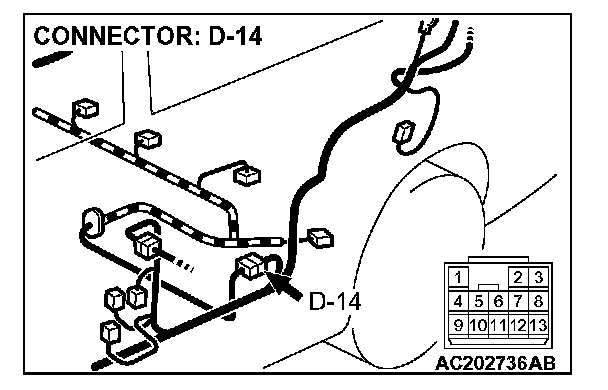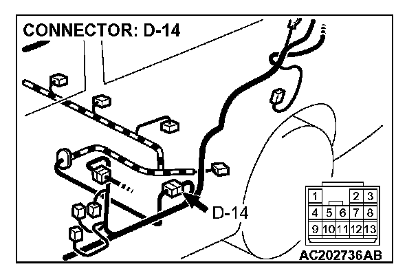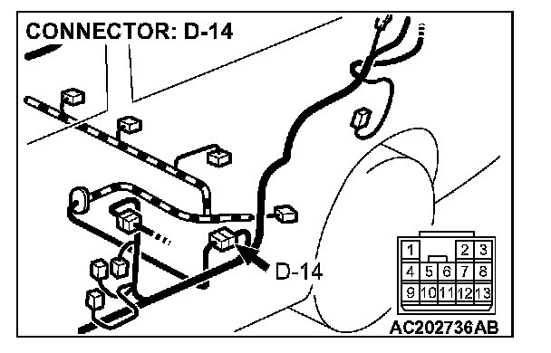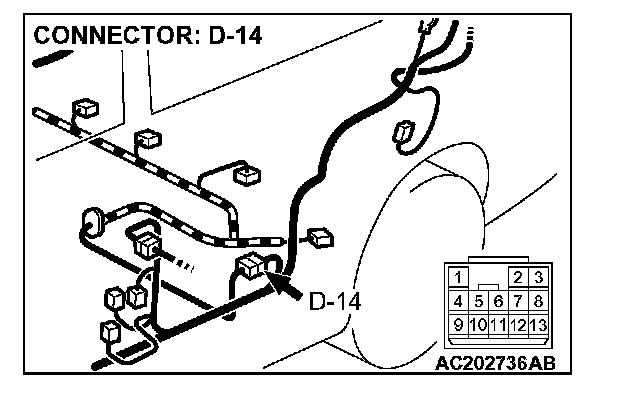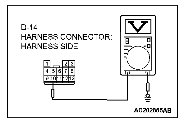 3. Measure the voltage between connector D-14 terminal 10 and ground by backprobing.