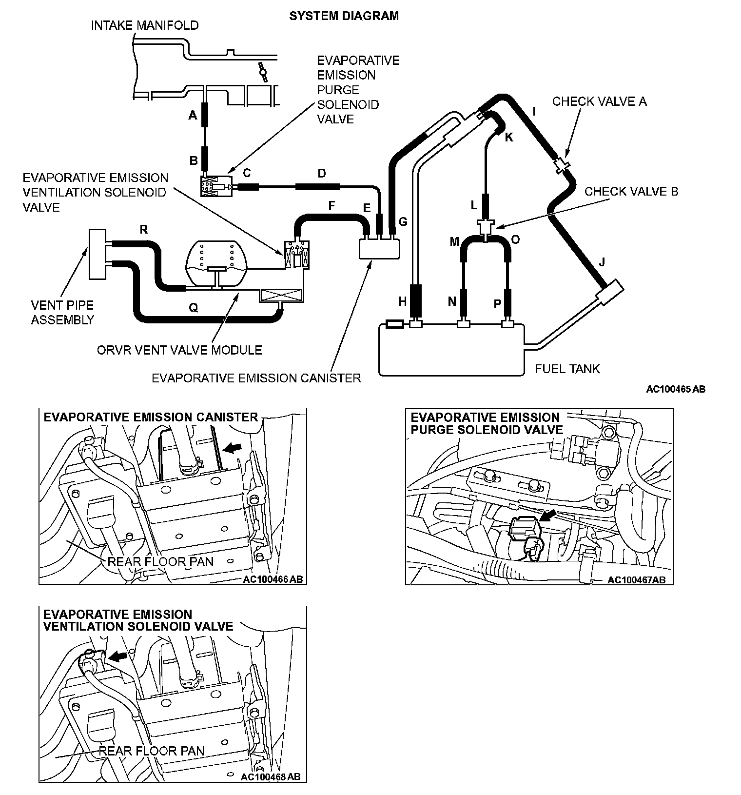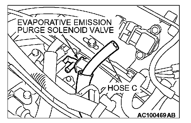 1. Disconnect hose C from the evaporative emission purge solenoid and connect a hand vacuum pump to the nipple of the evaporative emission purge solenoid.