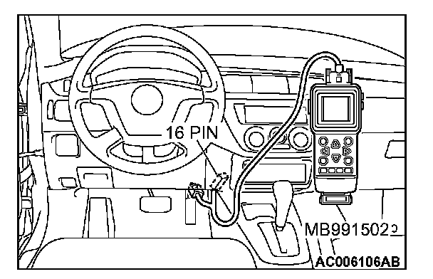 CAUTION: To prevent damage to scan tool MB991502, always turn the ignition switch to the "LOCK" (OFF) position before connecting or disconnecting scan tool MB991502.