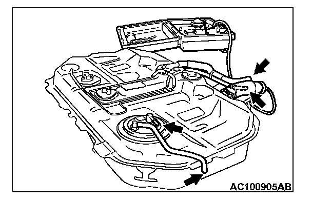 There are leaks at the fuel pump assembly, the fuel tank differential pressure sensor, leveling valve or the fuel tank rollover valve installation section. : After reassemble the leaked parts, check again that there are no leaks. Then reinstall the fuel tank. Go to Step 15.