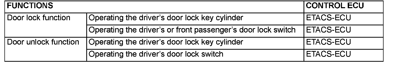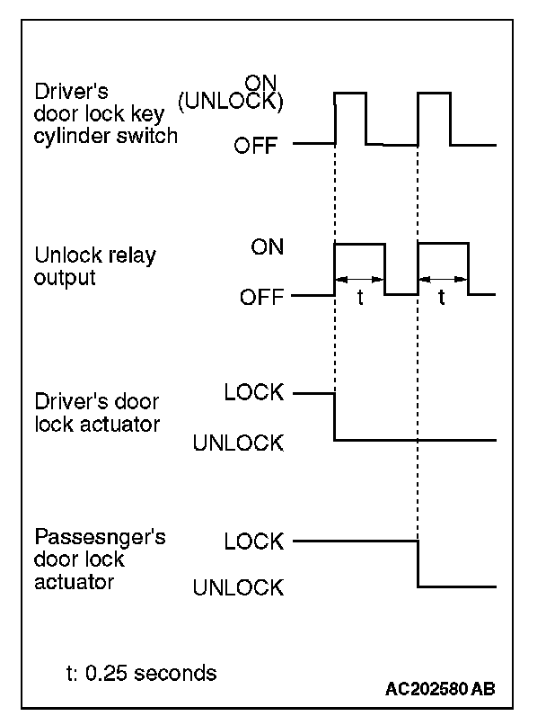When you insert the ignition key to the driver's door lock key cylinder and turn the key counterclockwise to unlock the door, the ETACS-ECU energizes its door unlock relay for 0.25 second to activate only the driver's door lock actuator. Then only the driver's door will be unlocked. When you turn the key counterclockwise again, the ETACS-ECU energizes its door unlock relay for 0.25 second to activate all the door lock actuator. Then all the doors will be unlocked.