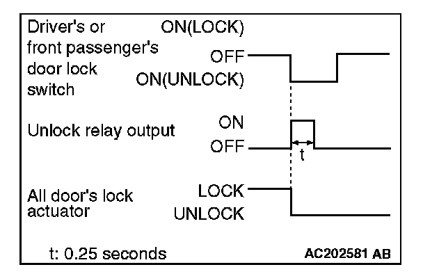 When the door is unlocked by driver's or front passenger's door lock switch, the ETACS-ECU energizes its door unlock relay for 0.25 second to activate all the door lock actuators. Then all the doors will be unlocked.