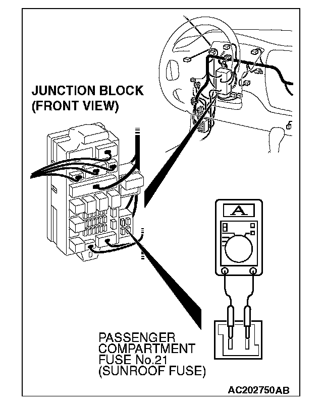 2. Turn ON the sunroof switch then measure the operating current of the intermediary segment when operations is starting, the sunroof is fully closed, the sunroof is fully opened and the sunroof is tilted fully up.