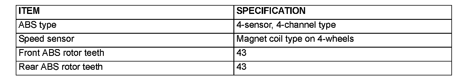 GENERAL DESCRIPTIONABS has been adopted as optional equipment in vehicles to maintain directional stability and steering performance during sudden braking. The ABS control method used is a 4-sensor, 4-channel method which provides independent control for all wheels. The system has the following features.