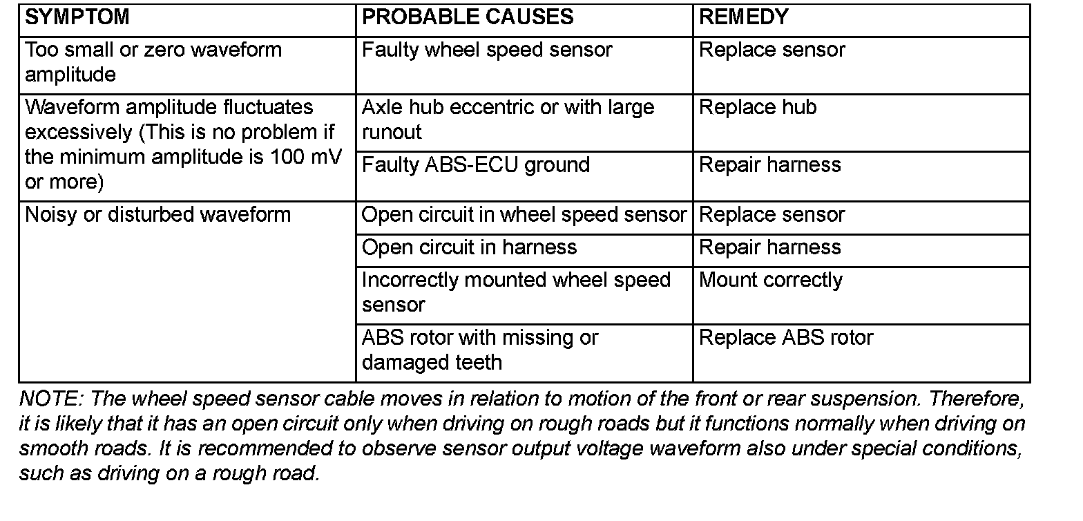 NOTE: The wheel speed sensor cable moves in relation to motion of the front or rear suspension. Therefore, it is likely that it has an open circuit only when driving on rough roads but it functions normally when driving on smooth roads. It is recommended to observe sensor output voltage waveform also under special conditions, such as driving on a rough road.