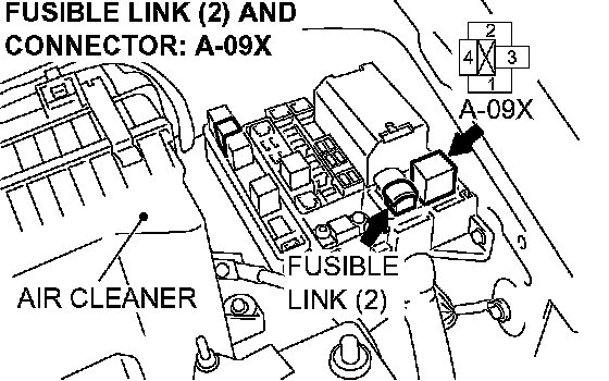 STEP 4. Check for harness damage between fusible link number 2 and fan control relay connector A-09X (terminal 4).