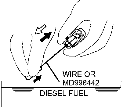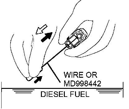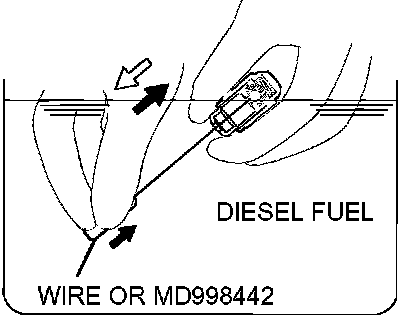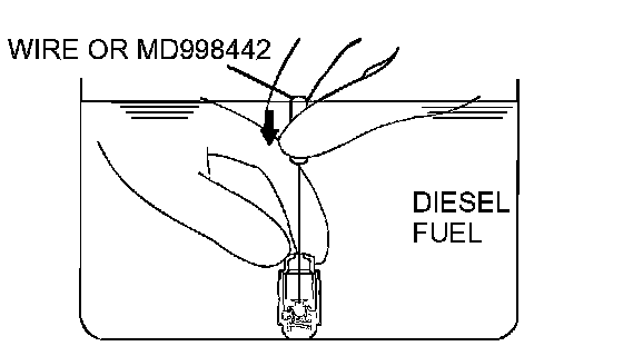 3. While gently pushing down the internal steel ball using wire [0.5 mm (0.020 inch) in diameter] or special tool MD998442, move the plunger through 5 to 10 strokes until it slides smoothly. In addition to eliminating stiffness in the plunger, this operation will removed dirty oil.