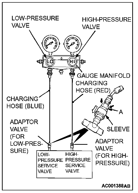 NOTE: The high-pressure service valve is on the liquid pipe A and the low-pressure service valve is on the suction hose.