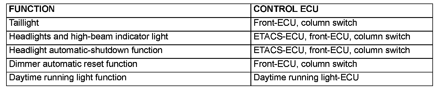 The daytime running light-ECU constantly lights up the high beam in a reduced beam state if the ignition switch is in the ON position when the headlight switch is in the "OFF" or "TAIL" position. If the headlights illuminate while the daytime running light function operates, the daytime running light-ECU shut the high-beam down.