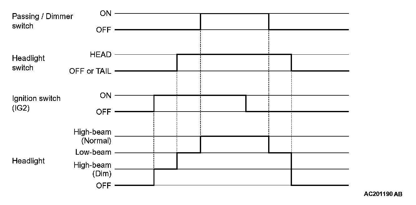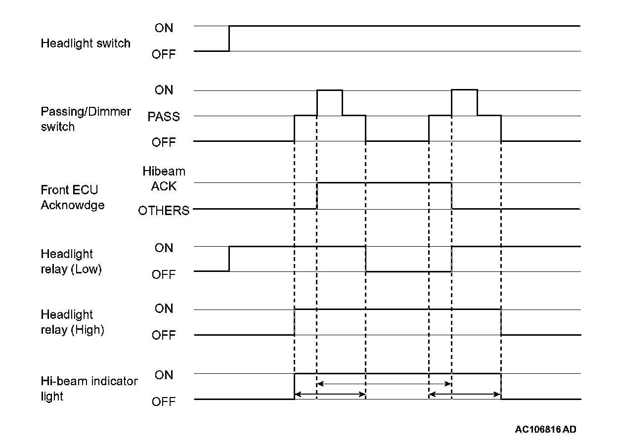 The front ECU lights up the headlight (LOW) when the signal from the column switch to the headlight switch is in the " ON state and the built-in head light relay (LOW) is in the ON state. If the dimmer switch is turned on while the headlight relay (LOW) is on, the front-ECU turns on the headlight relay (HIGH), causing the high-beam headlights to illuminate.