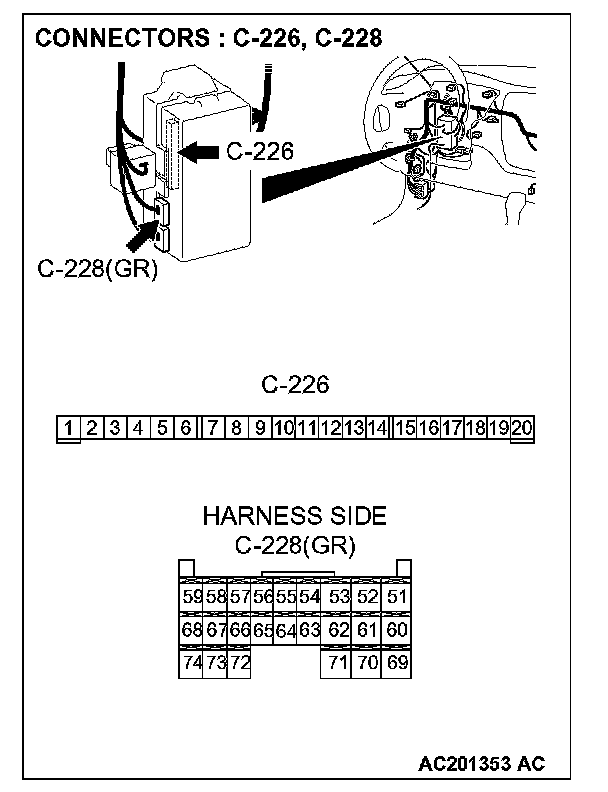 STEP 4. Check ETACS-ECU connector C-226 and C-228 for loose, corroded or damaged terminals, or terminals pushed back in the connector.