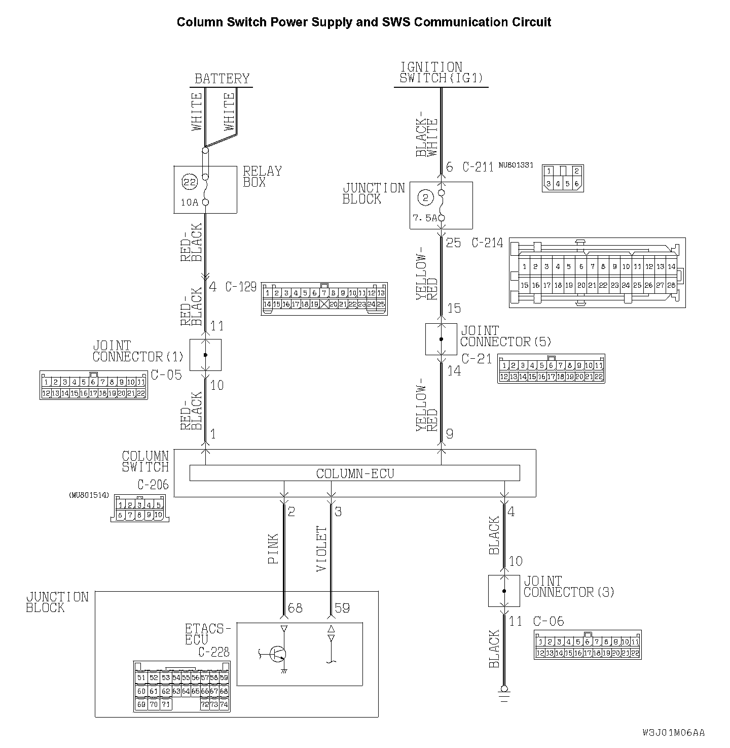 Communication with the column switch (column-ECU) is not possible.NOTE: This troubleshooting procedure requires the use of scan tool MB991502 and SWS monitor kit MB991862. For details on how to use the SWS monitor, refer to "How to use SWS monitor.