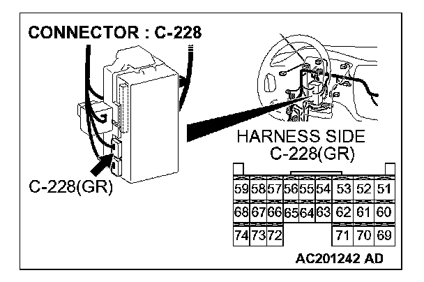 STEP 12. Check the wiring harness between column switch connector C-206 (terminal 2) and ETACS-ECU connector C-228 (terminal 68).