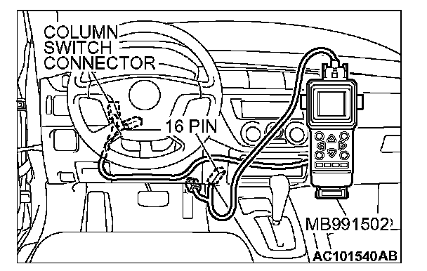 CAUTION: To prevent damage to scan tool MB991502, always turn the ignition switch to the "LOCK" (OFF) position before connecting or disconnecting scan tool MB991502. Connect the DLC harness before connecting the column-ECU harness. Be sure to connect SWS monitor kit MB991862 after turning on scan tool MB991502.