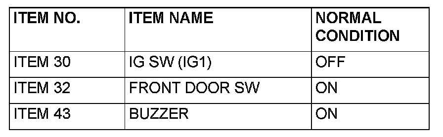 Q: Are normal conditions displayed on the "IG SW (IG1)", "FRONT DOOR SW" and "BUZZER"?