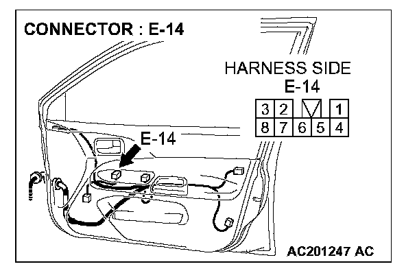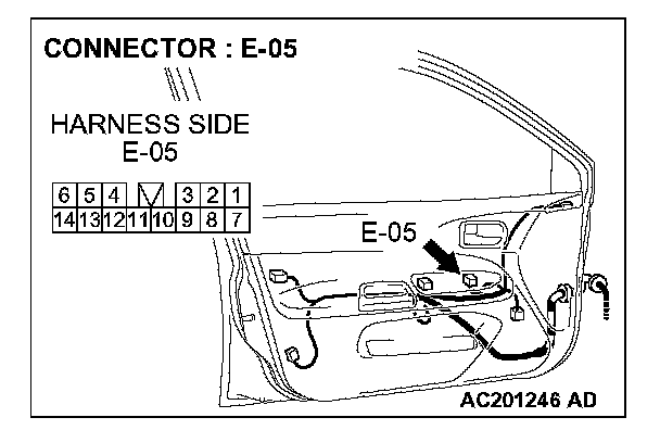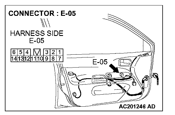 STEP 14. Check the wiring harness between power window main switch connector E-05 (terminal 11) and front power window sub-switch (RH) connector E-14 (terminal 8).