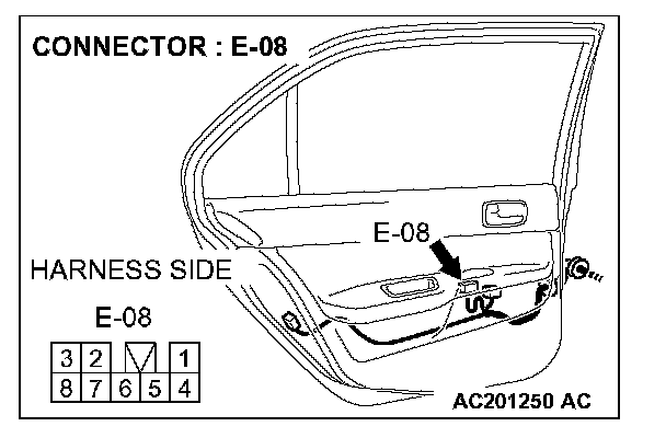 1. Disconnect rear power window sub-switch (LH) connector E-08 and measure the voltage available at the wiring harness side of the connector.