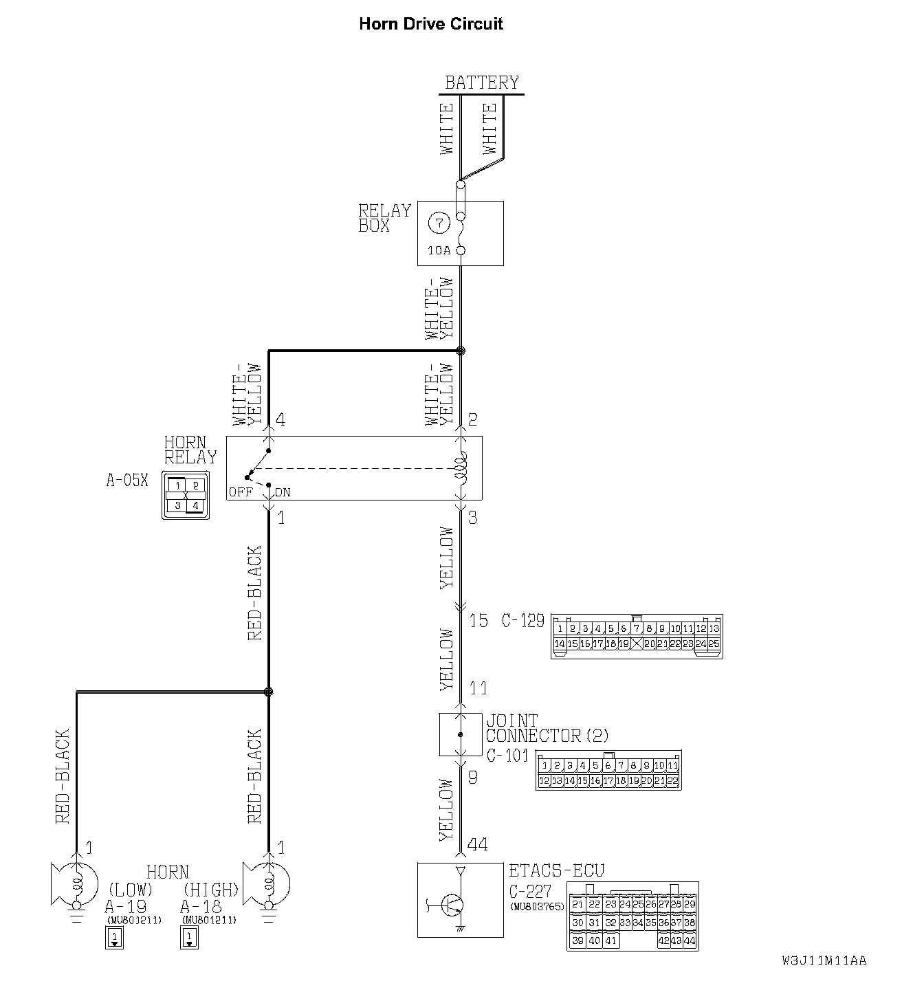 STEP 20. Check the wiring harness between horn relay connector A-05X (terminal 3) and ETACS-ECU connector C-227 (terminal 44).