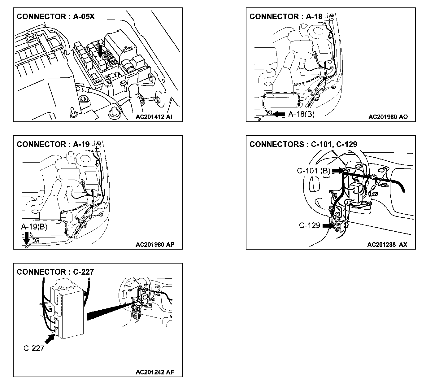 STEP 19. Check rear horn relay connector A-05X and ETACS-ECU connector C-227 for loose, corroded or damaged terminals, or terminals pushed back in the connector.