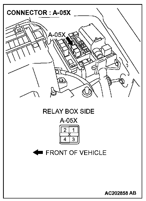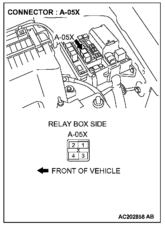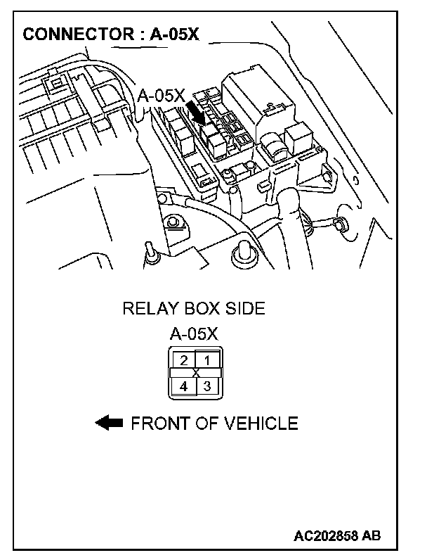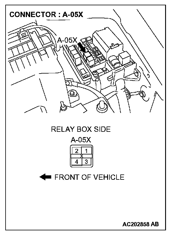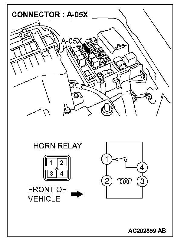 1. Disconnect horn relay connector A-05X and measure the voltage available at the relay box side of the connector.