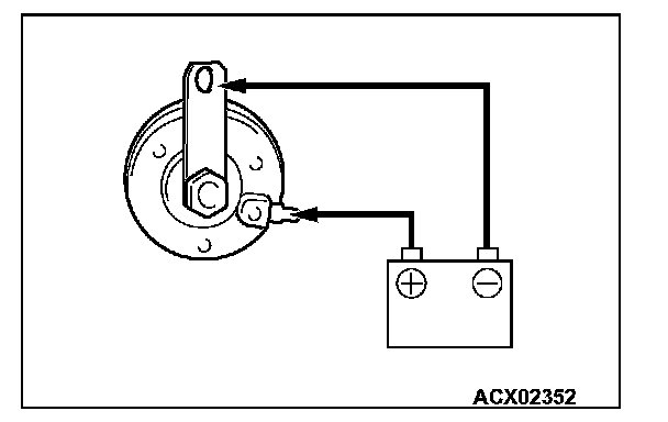 Connect the battery as shown, and Verify that the horn sounds.