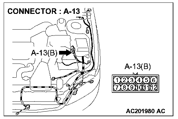 NOTE: Also check intermediate connector A-13 for loose, corroded, or damaged terminals, or terminals pushed back in the connector. If intermediate connectors A-13 is damaged, repair or replace the damaged component(s) as described in Harness Connector Inspection.