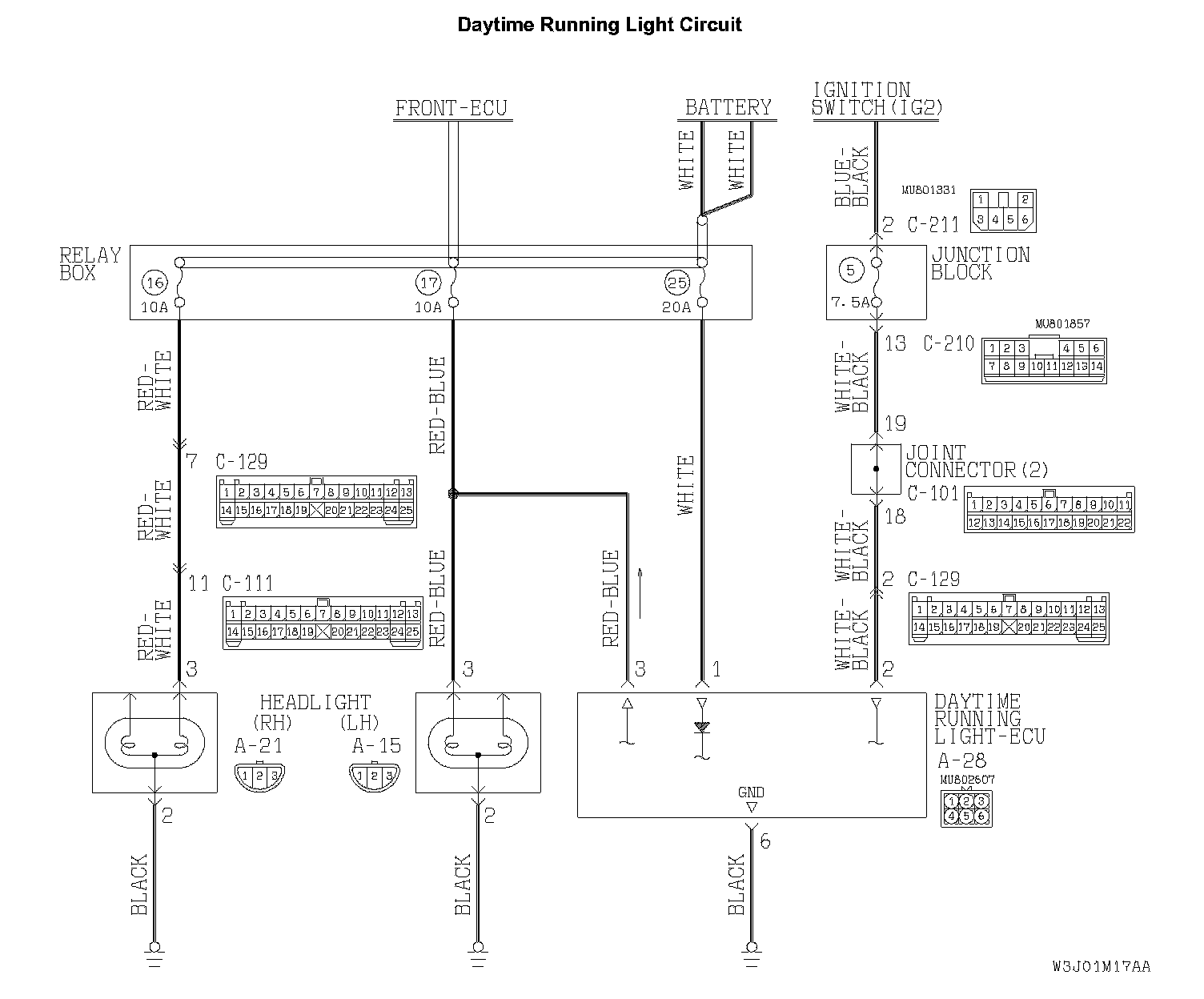 STEP 8. Check the ignition switch (IG2) line of the power supply circuit to the daytime running light-ECU. Test at daytime running light-ECU connector A-28.