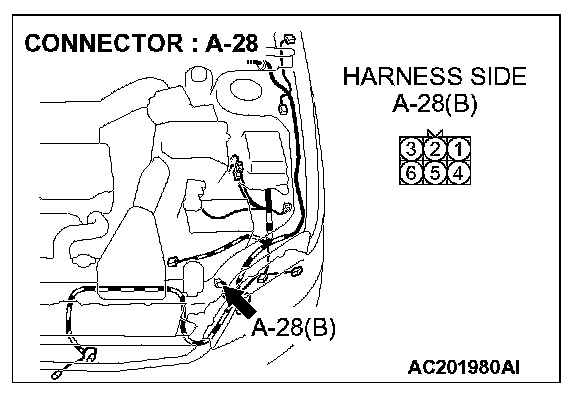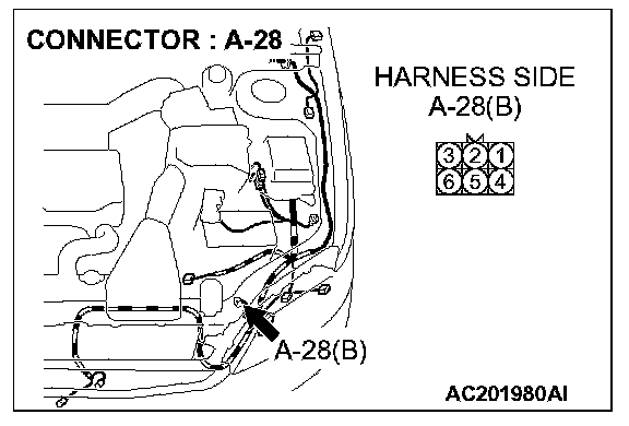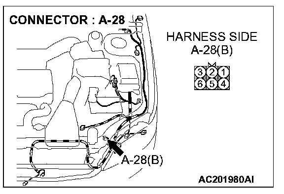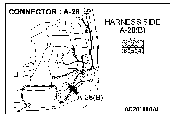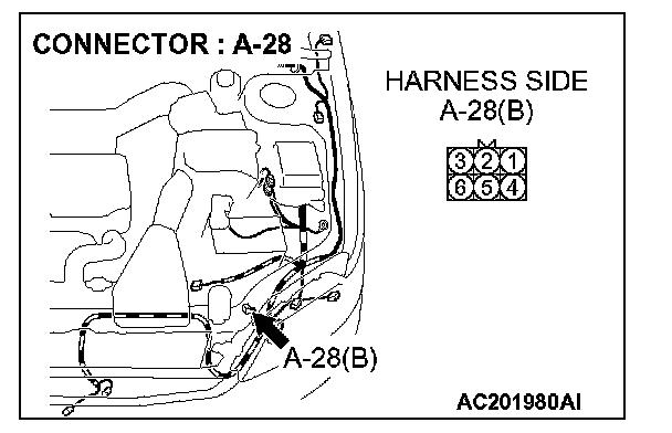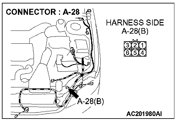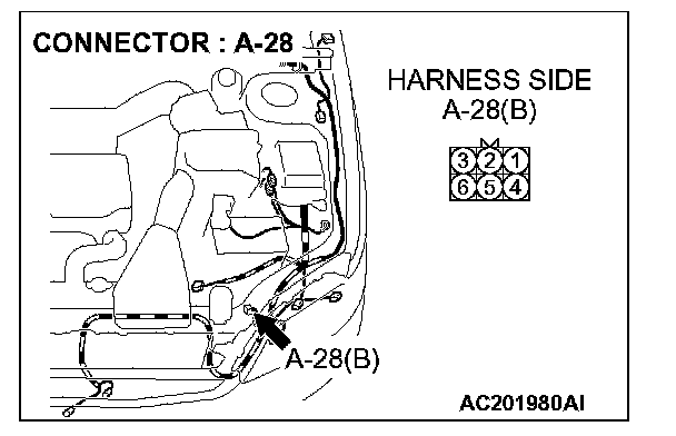 STEP 7. Check the wiring harness between daytime running light-ECU connector A-28 (terminal 6) and ground.