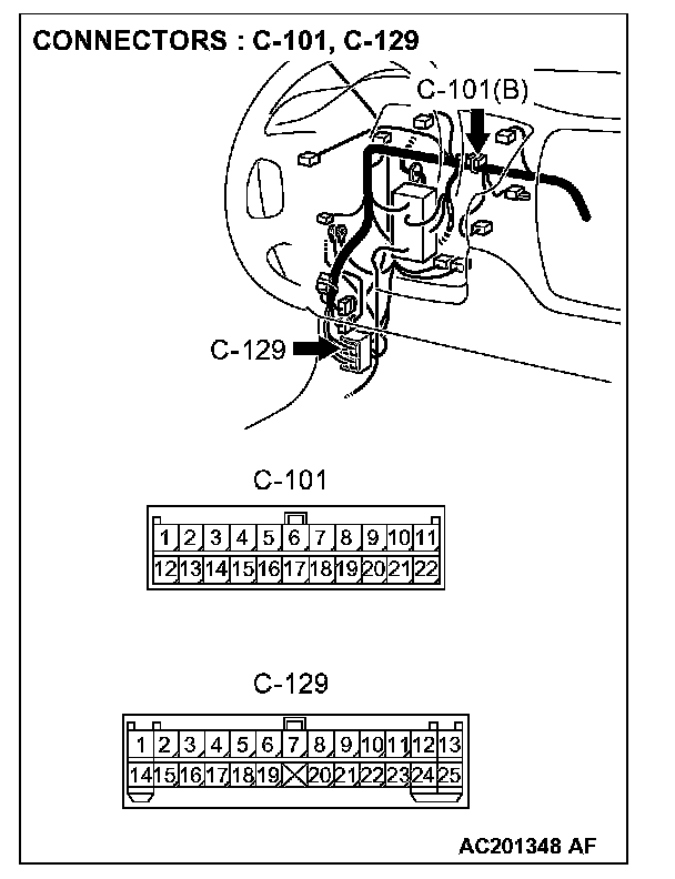 NOTE: Also check junction block connectors C-210, C-211, joint connector C-101 and intermediate connector C-129 for loose, corroded, or damaged terminals, or terminals pushed back in the connector. If junction block connector C-210, C-211, joint connector C-101 or intermediate connector C-129 is damaged, repair or replace the damaged component(s) as described in Harness Connector Inspection.