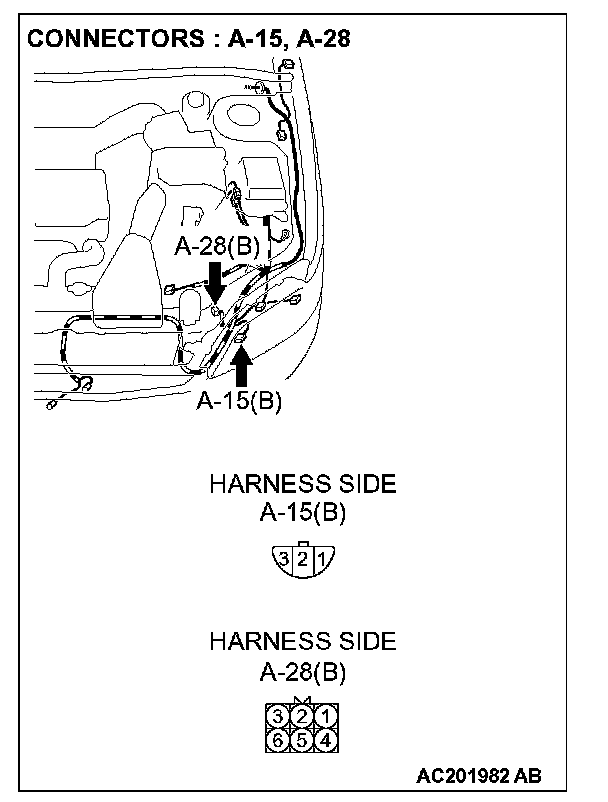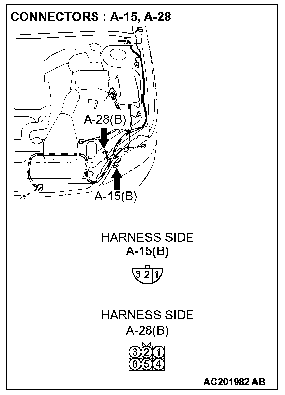 STEP 12. Check the wiring harness between daytime running light-ECU connector A-28 (terminal 3) and the headlight (LH) connector A-15 (terminal 3).