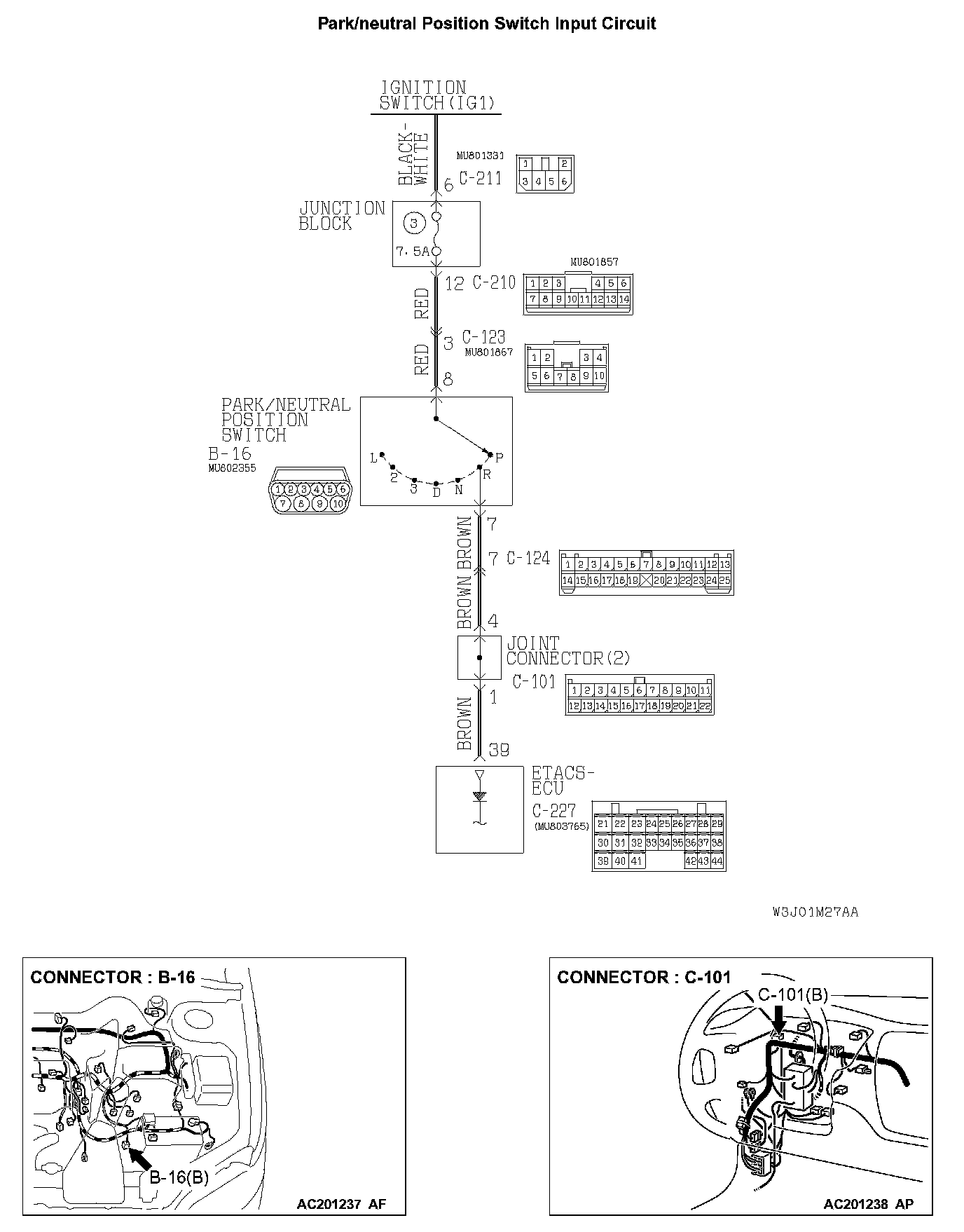 Q: Are park/neutral position switch connector B-16 and ETACS-ECU connector C-227 in good condition?
