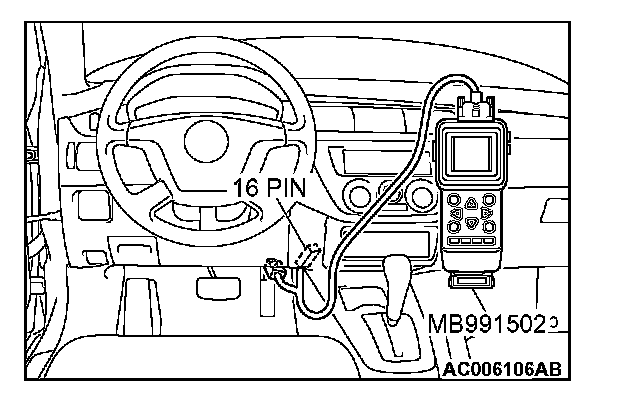 CAUTION: To prevent damage to scan tool MB991502, always turn the ignition switch to the "LOCK" (OFF) position before connecting or disconnecting scan tool MB991502.
