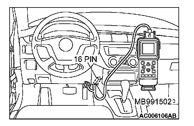 CAUTION: To prevent damage to scan tool MB991502, always turn the ignition switch to the "LOCK" (OFF) position before connecting or disconnecting scan tool MB991502.