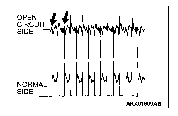 - Current is not supplied to the motor coil on the open circuit side. (Voltage does not drop to 0 volt.) Furthermore, the induced electromotive force wave pattern at the normal side is slightly different from the normal wave pattern.