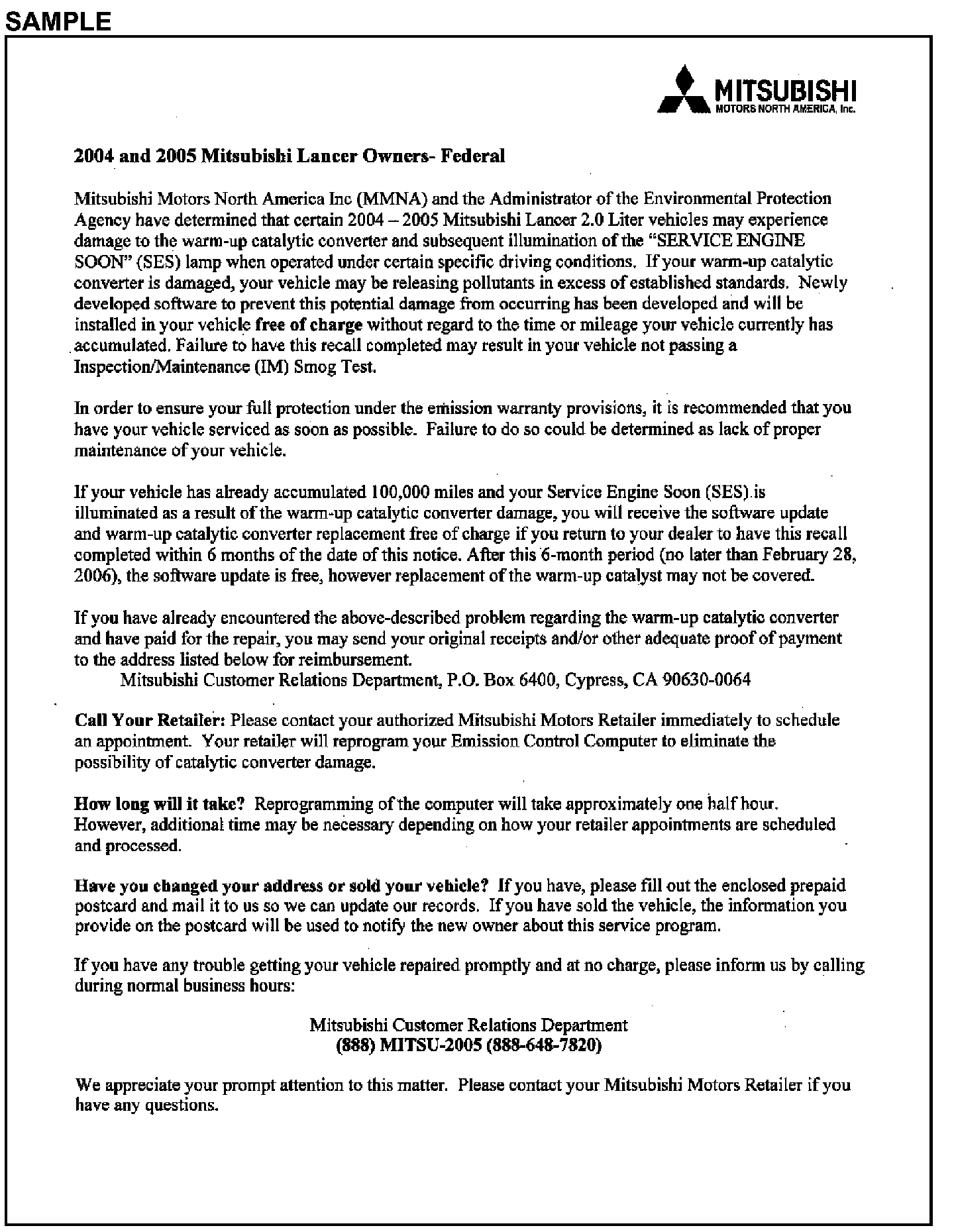 Owner Letter - 2004 & 2005 Mitsubishi Lancer Owners - Federal