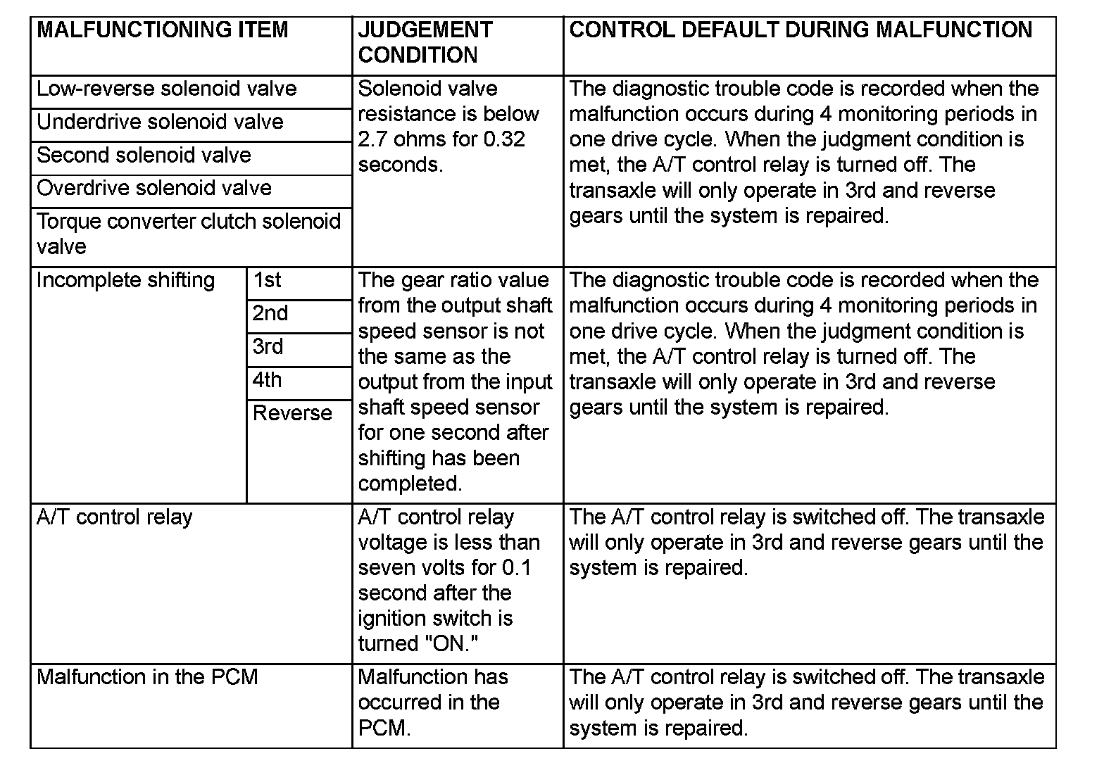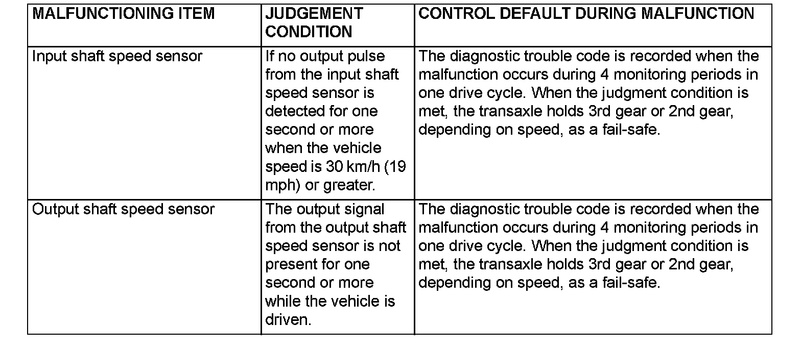 When a malfunction of a main sensor or actuator is detected by the PCM, the transaxle is controlled by pre-set control logic to maintain safe conditions for driving.