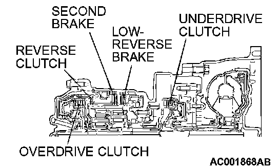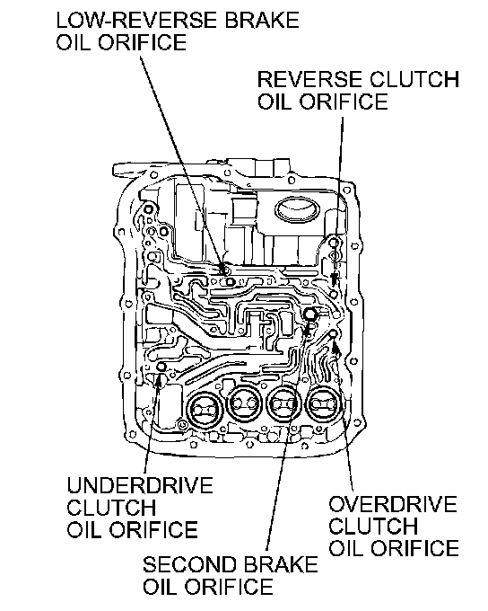 2. Blow 108 kPa (15 psi) compressed air into the each brake oil orifice and clutch oil orifice of the transaxle case, and check if each brake and each clutch piston move and air pressure is maintained.