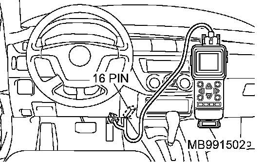 CAUTION: To prevent damage to scan tool M B991502, always turn the ignition switch to the "LOCK" (OFF) position before connecting or disconnecting scan tool MB991502.